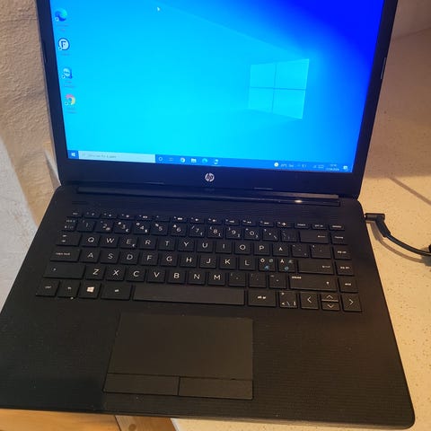 HP bærbar PC i svart utførelse. Modellen har skjerm i området 14–15 tommer og standard tastaturoppsett. Leveres med strømadapter og strømkabel, som vist på bildene.