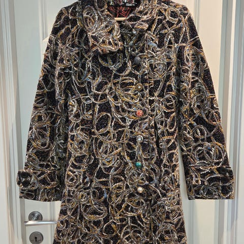 Desigual kåpe for dame i størrelse 38. Kåpen er brun med elegant, mønstret struktur. Den har god innsving, og er veldig flatterende på.