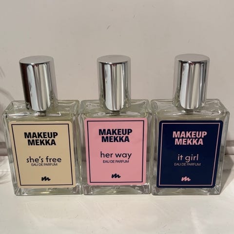 Makeup Mekka It Girl, She’s Free og Her Way parfyme sett eau de parfum. Settet består av tre individuelle flasker med eau de parfum i rektangulære glassflasker med sølvfarget kork. Hver duft leveres i egen rosa eske. Egner seg som parfyme til kvinner eller unisex, avhengig av preferanse. Nøyaktig volum per flaske 30 ml