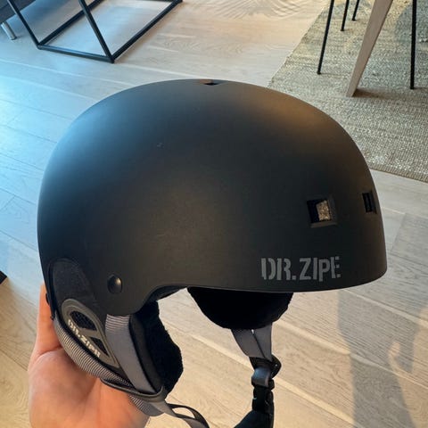 Dr. Zipe Model 11 skihjelm i størrelse S/M. Hjelmen er svart og har glatt, matt ytterskall. Den har justerbar hakestropp med klips og øreputer med Dr. Zipe-logo. På toppen er det feste som kan brukes til for eksempel actionkamera. På innsiden er det polstret og pustende fôr for økt komfort. Hjelmen er CE-merket etter EN 1077-standarden for alpinhjelmer. Leveres sammen med Dr. Zipe skibriller og oppbevaringspose for brillene, slik det vises på bildene.