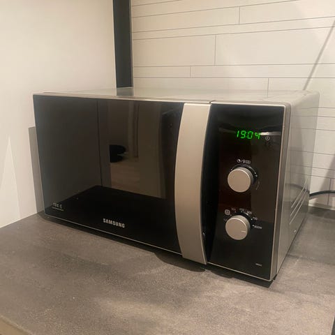 Samsung mikrobølgeovn i svart utførelse. Frittstående modell med frontåpning og sidehengslet dør. Innvendig roterende glassplate for jevn oppvarming. Betjeningspanel med knapper på høyre side for valg av effekt og funksjoner. Egnet til oppvarming og tining av mat i hverdagsbruk på kjøkkenet.