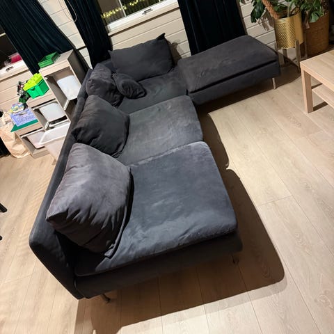Selger denne fine Söderhamn sofaen fra IKEA. Sofaen har vanlige bruksmerker. Fint og behagelig stoff i mørk grå/sort med spill i, avtagbare trekk. Må hentes og modulene kan demonteres for enklere frakt.