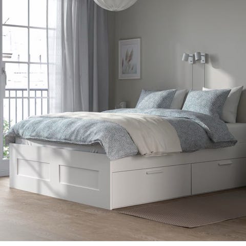 IKEA Brimnes seng med oppbevaring i hvit farge. Sengen har mål på 160/200 cm og inkluderer skuffer for ekstra oppbevaringsplass under sengen. Passer for standard dobbeltsengmadrass.