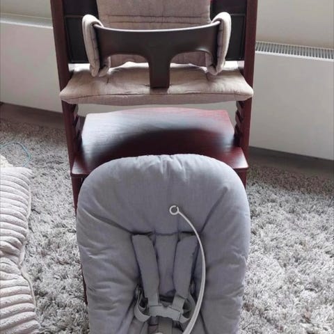 Stokke tripp trapp stol selges med babysett og spisebrett. I fargen hvit. Stol har slitasje på malingen,men fremstår solid og stabil. Den er den nye modellen som også passer til Newborn Seat, og alt nytt utstyr fra stokke.