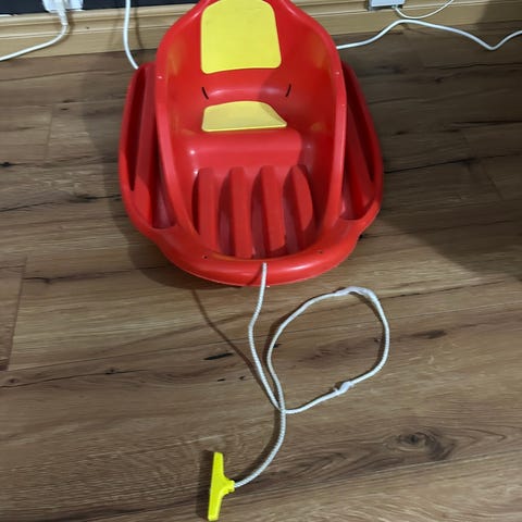 Stiga akebrett med ryggstøtte i grønn plast. Akebrettet har integrert sete med høy rygg og støtte i front, samt tau i front for trekking og styring. Egnet for små barn som trenger ekstra støtte under aking. Passer til vinterlek i bakker og på snøføre.
