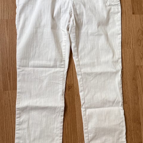H&M Wide &Denim jeans for dame i hvit denim. Buksen er i størrelse EUR 34 med livvidde W34. Modellen har vid passform, høyt liv og cropped benlengde. Klassisk 5-lommers jeans med glidelåsgylf og knapp i livet. Materiale i denim gir et robust og strukturert uttrykk.