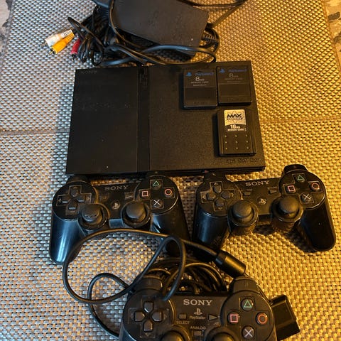 Sony Playstation 2 Slim konsoll med minnekort, kontrollere og spill