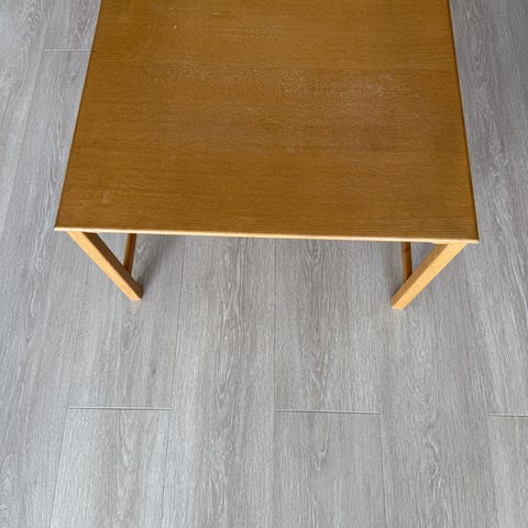 Møbel som kan brukes til benk eller bord. Puten kan fjernes. Tyngden tilsier at det er heltre.