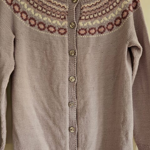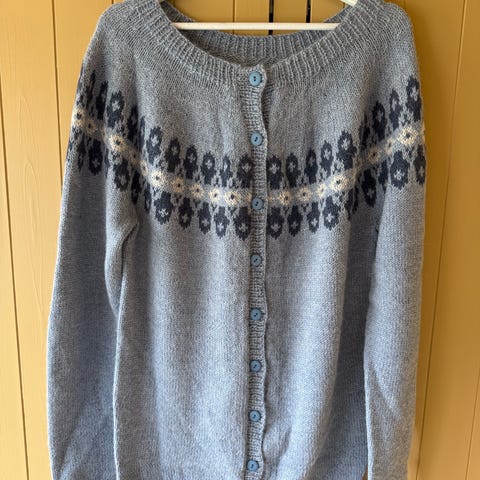 Strikket for liten, bryst mellom 90 og 100 cm , lengde 53 cm, arm 46 cm, selges for garnpris.