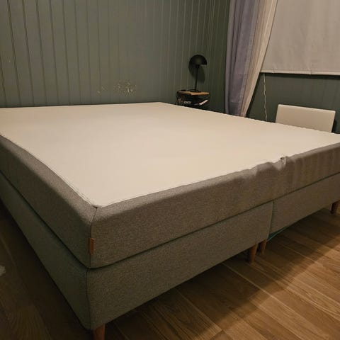 2 enkeltsanger inkl madrasser. Sengene har ramme i mørkt tre med metallistdetaljer. Det er et par synlige merker og avskalling i treverket på enden av sengene, som vist på bildene. Passer som dobbeltseng i soverom eller gjesterom. Mål: L:205cm,