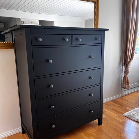 Solid, romslig og skikkelig kvalitetsmøbel fra Hemnes-serien. Denne kommoden har blitt malt i en mørk, matt farge som gir den et moderne og eksklusivt uttrykk – etter min mening ser den enda bedre ut nå enn originalt.