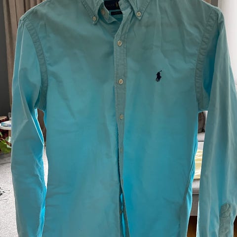 Ralph Lauren Polo skjorte for herre i størrelse S. Skjorten er blå og laget av bomull. Modellen har lange ermer, knappestolpe foran og klassisk krage med knapper. Brodert logo på brystet. Passer til både hverdagsbruk og mer formelle anledninger.