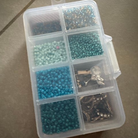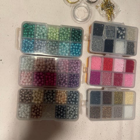 Diverse uåpnede og halvfulle perlesett med et stort utvalg små perler i ulike former og størrelser. Inneholder flere oppbevaringsbokser med rominndeling samt mange poser med perler i blandede farger, inkludert bokstavperler. Egnet til hobbyprosjekter som friendship bracelets, armbånd, dekorasjon, håndarbeid og annet kreativt arbeid. Antall perler og nøyaktige størrelser er ikke spesifisert, se bilder for oversikt over innholdet i settet. Kan hentes på Leangen eller sendes med Fiks ferdig, pakker godt.