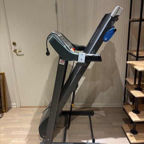 Elektrisk tredemølle med digitalt display som viser blant annet tid, hastighet, distanse og kalorier. Panelet har egne knapper for start, stopp, hastighet og stigning (incline). Nødstoppsnor er plassert foran for økt sikkerhet.