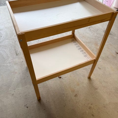 IKEA sammenleggbart stellebord i svart tekstil med hvitt mønster. Stellebordet har kryssben i metall og tekstilkurv under til oppbevaring av bleier, klær eller annet utstyr. Egnet til stell av baby på bad eller barnerom der det er behov for en plassbesparende løsning som kan foldes sammen når det ikke er i bruk.
