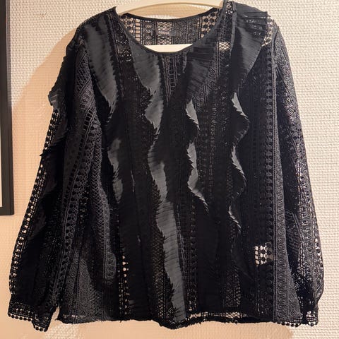 Donna genser for dame i størrelse 40. Genseren er svart med lyst prikkemønster og er laget i polyester. Modellen har lange ermer med mansjetter og knappelukking i nakken, samt lett transparent ytterstoff med underlag som gjør den mindre gjennomsiktig. Passer til hverdagsbruk eller mer formelle anledninger, og kan kombineres med både bukser og skjørt.