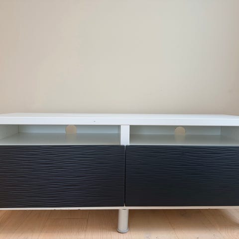 Hvit Ikea Bestå med høyglans skapdører. Det medfølger en glassplate på toppen av benken. TV benken er pent brukt og har ingen synlige merker. Nypris for tilsvarende tv benk er omtrent 3500,-