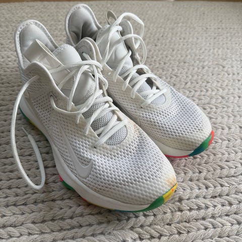 Nike basketballsko i rødt med flerfargede detaljer. Skoene har snøring kombinert med stropp over vristen for ekstra støtte. Overdelen ser ut til å være i tekstil/syntetisk materiale, med polstret hælkrage for komfort. Sålen er i gummi med mønster som gir grep på innendørs underlag. Egnet som basketsko eller fritidssko.