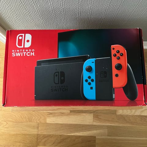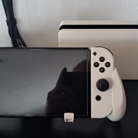 Nintendo Switch spillkonsoll i hvitt. Håndholdt og stasjonær hybridkonsoll med avtakbare Joy-Con-kontrollere. Konsollen kan brukes både i håndholdt modus og koblet til TV via dokkingstasjonen som følger med på bildene. Egnet for ulike typer videospill og flerspillerbruk lokalt og online, avhengig av spill og tilbehør som benyttes.