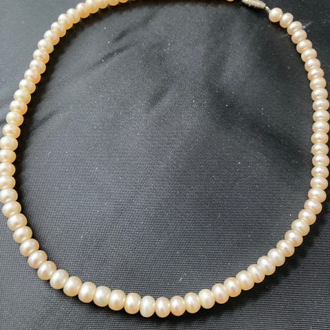 Nydelig halskjede i ekte kulturperler selges. Runde, lyse perler og sølvlås. Perlene er mindre på den øvre/bakre delen, og så blir de større nedover mot midten - og dette gir kjedet et unikt og ekstra elegant uttrykk. Lengden på kjedet er ca 52cm. Låsen er i 835 sølv. Passer som vintage og klassisk smykke til ulike antrekk og anledninger. I meget god stand og veldig pent! Perleøredobber følger med (ekte perler og gull-"pinne", men uten selve låse-"knotten").