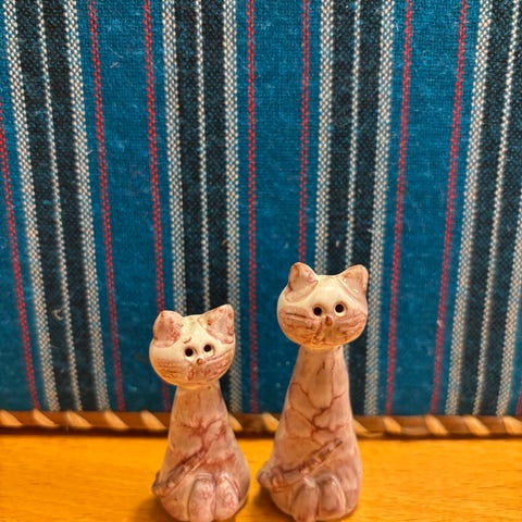 Keramikkglass med kattemotiv i flere farger. Glassene har illustrasjon av katter på utsiden, med blå og grønne fargetoner og detaljer i hvitt og sort. De står på liten fot og egner seg til servering av drikke eller som dekorative pyntegjenstander. Passer på kjøkken, spisebord eller i vitrineskap.
