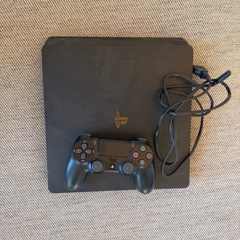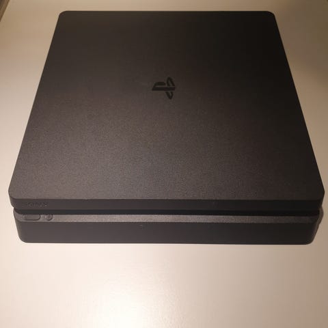 Sony Playstation 4 spillkonsoll med to trådløse kontrollere i svart og blått. Konsollen støtter et bredt utvalg av spill til Playstation 4-plattformen. Har Disc . 500 GB / slim versjon .
