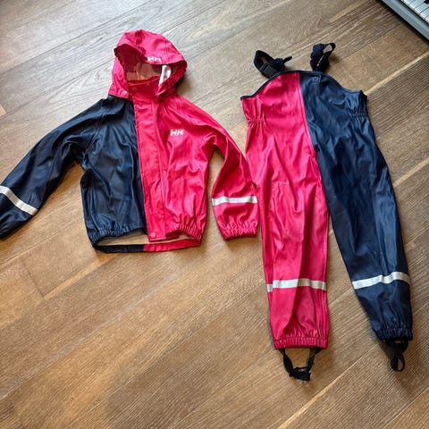 Helly Hansen regnsett for barn i størrelse 110. Settet består av jakke og bukse i rosa polyester. Jakken har hette, glidelås foran og refleksdetaljer på ermene. Buksen har strikk i livet og nederst ved bena for bedre passform. Passer til jente og er egnet som yttertøy i vått vær og til lek ute.