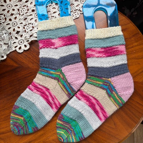 Håndstrikkede ullsokker i rosa og lilla/grønn nyanser.
