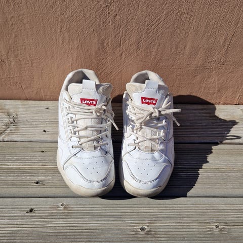 Hvite Levi’s sko, som nye, kun brukt en gang. Selges da de dessverre ble litt for store. Står str 37 i skoen, men oppleves mer som str 37,5. er veldig gode å gå i og passer godt til både jeans og kjole.