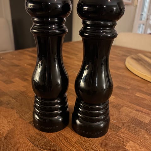 Le Creuset salt- og pepperkvernsett. Settet består av to kverner beregnet for henholdsvis salt og pepper. Kvernene har klassisk Le Creuset-design med justerbar kvernemekanisme på toppen. Egnet til bruk på kjøkkenet og ved servering ved bordet. Høyde 11 cm, farge Azure blue