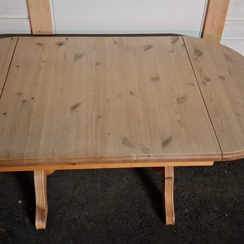 Selger dette da vi skal flytte og ikke vil kaste det. Bordet er i en lyserosa farge og har tre ben. Bordet er godt brukt og har noen synlige bruksmerker. Heltre furu, maling kan slipes bort om man vil ha et trehvit bord.