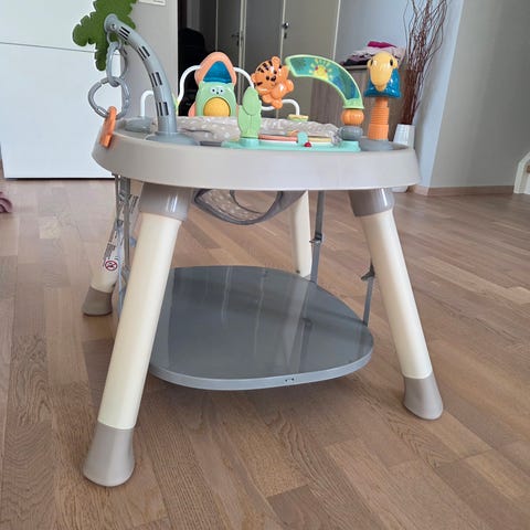 Min sønn har elsket denne og har hjulpet oss mye! Aktivitetssenter fra Beemoo med fem underholdende aktivitetsleker. Det har en morsom hoppeplate og justerbare bein for å passe barn av forskjellige høyder. Når barnet ditt er for stort til å sitte i aktivitetssenteret, kan det gjøres om til et lekebord. Leveres med avtagbare bordplater. Perfekt for å trene på problemløsning og finmotorikk.