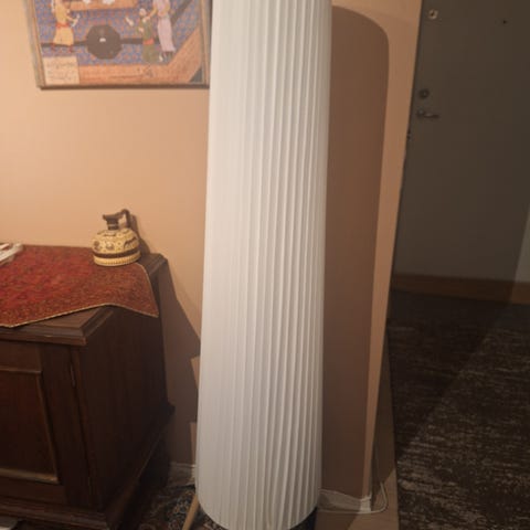 Gulvlampe i metall med svart stamme og hvit innerskjerm. Høyde 127 cm, diameter sokkel 23 cm. Lampen har et svakt, ovalt design med vertikale metallstenger rundt skjermen. Gir stilig lys. Tre lyspærer fordelt vertikalt.