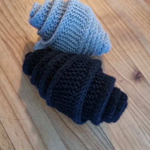Dette er strikket i en tråd merinoull og en tråd silkmohair. Det måler 120 cm