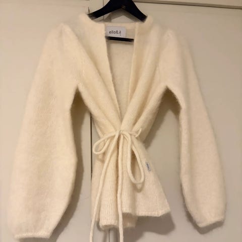 ella&il cardigan for dame i størrelse XS. Oppleves som romslig i størrelse.Cardiganen er grønn og strikket i mohairull, som gir et mykt og loddent uttrykk. Den har rund hals, knepping foran og påsydde lommer. Passer som et lett lag over topper, skjorter eller kjoler til hverdagsbruk og enkle anledninger. Nyoris 3400kr.