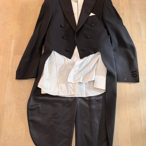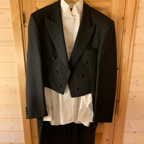 Kjole og hvitt, pent brukt 3-4 ganger i L slim.