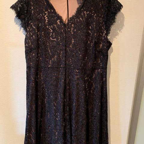 H&M festkjole for dame i størrelse XL (EUR 46). Kjolen er rosa og laget i polyester med blondelignende mønster ytterst og glatt fôr under. Den har rund hals, trekvart lange ermer og rett passform. Lukkes med knapp i nakken. Egnet til fest og andre anledninger der man ønsker en enkel og pen kjole.