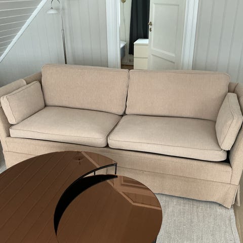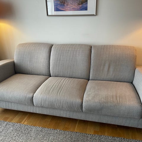 Ukjent merke, kjøpt brukt. Avtagbare putetrekk. Kan sannsynligvis vaskes. Noen nupper, kan lett fjernes.