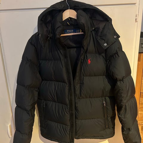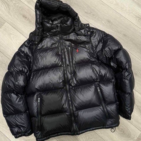 Ralph Lauren vinterjakke for herre i størrelse XL. Jakken er svart og fylt med dun. Den har hette og glidelåslukking foran. Egnet som ytterjakke i kaldt vær.