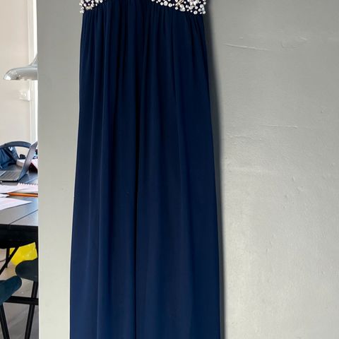 Floyd festkjole for dame i størrelse str 14 (L?). Lang kjole i blå polyester med V-utringning foran og bak. Kjolen har korte, løstsittende ermer og markert midje med dekorativ perle- og steinbroderi rundt livet. Stoffet er lett plissert i overdelen og har fallende skjørt. Egnet som penkjole til formelle anledninger, selskaper og andre festlige sammenhenger. Fantastisk behagelig sekspakning bruk kun et par timer.
