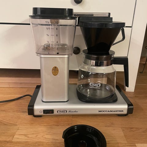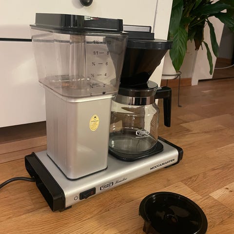 Pent brukt Moccamaster kaffetrakter med glasskanne, designet for effektiv kaffebrygging. Utstyrt med vannbeholder og filterholder i svart plast, og en glasskanne med håndtak. Passer for daglig bruk i hjem eller kontor, hentes på Løren eller vi kan levere i Oslo området for 100kr og vi kan møtes i byen også.