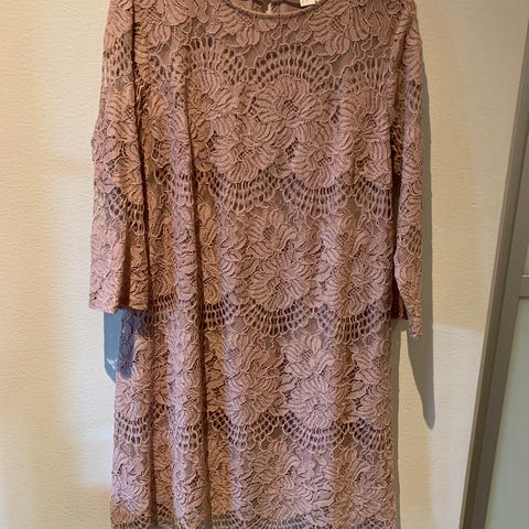 H&M festkjole for dame i størrelse XL. Kjolen er svart og laget i polyester med blondedetaljer ytterst og glatt fôr under. Modellen har V-utringning foran og bak, korte ermer med blondekant og glidelås i ryggen. Passer til formelle anledninger og festbruk.