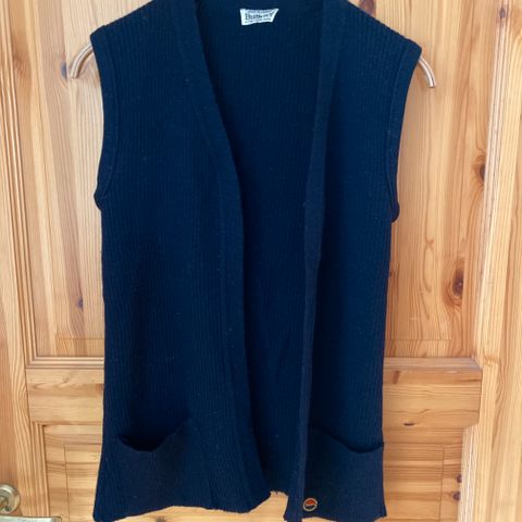 Busnel ullvest for dame i størrelse M. Vesten er grå og laget av 100 % ull. Den har V-hals, ribbestrikkede kanter og Busnel-logo på kanten. Passer som en enkel og varm hverdagsvest , lekker med en hvit bluse inni. . Vaskes etter anvisning på merkelapp (håndvask/skånsom behandling anbefales for ull).lengde fra skulder er 65 cm.