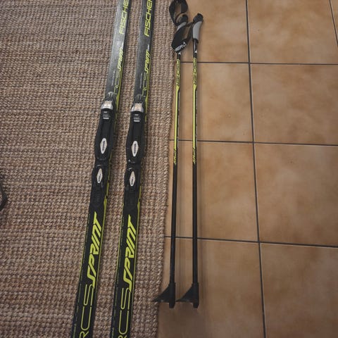 Pent brukte Fischer Twin Skin Sprint Jr felleski selges med staver.