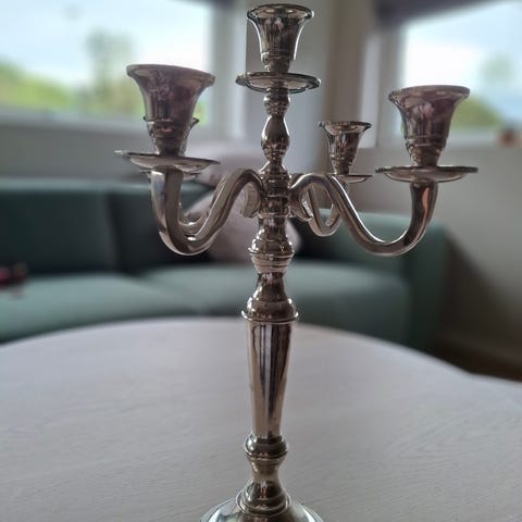Kandelaber, 3-armet i sølvfarget metall.