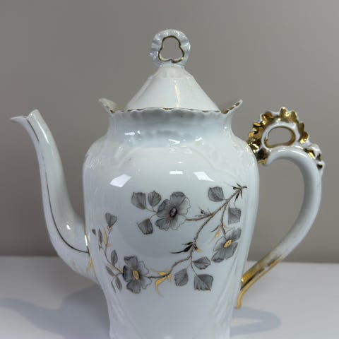 Elegant og tidstypisk kaffekanne i porselen fra Porsgrunds Porselænsfabrik, trolig modell 1320 med dekor 2129. Kannen er anslått å være over 100 år gammel, og fremstår som et vakkert og autentisk eksempel på norsk porselensproduksjon fra tidlig 1900-tall.