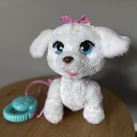 Den supersøte lille hund kommer med et kort bånd som kan kobles til andre bånd i håndtaket, slik at flere dyrefavoritter fra Walkalots Babies kan bli med på tur.