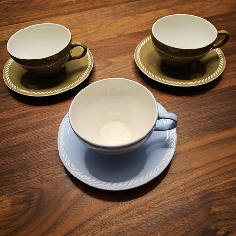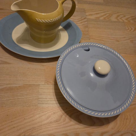 Enslig pen kopp med formgivning Ragnar Grimsrud og antar serien Sissel. Sjelden uten pastelfargene gul, blå, grønn og rosa. Produsert i perioden 1951-65. Send meg en melding hvis du leter etter en slik eller synes det var spennende å blande inn en hvit kopp i samlingen.