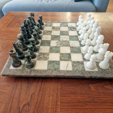 Sjakksett med sjakkbrett og komplette brikker i marmor. Brettet har felter i rød og beige marmor, og kant i lys marmor med naturmønster. Brikkene er utført i rød og lys/beige marmor som matcher brettet. Egnet som spillebrett og dekorativt innslag i interiøret.