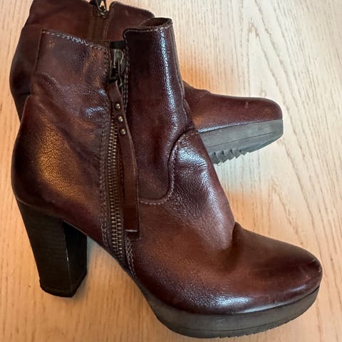 Brune høye snørestøvler i skinn i størrelse 36. Støvlene har hæl, snøring foran og glidelås på innsiden av skaftet for enklere av- og påtaking. Skaftet går opp mot leggen og gir god dekning. Passer til bruk i hverdagen eller til penere antrekk i kjøligere vær.